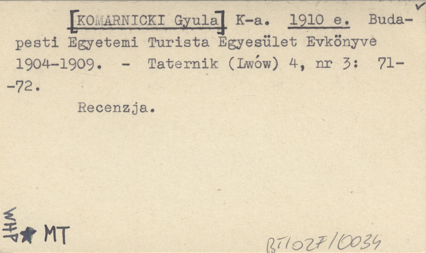 K-a. [KOMARNICKI Gyula] 1910 e Budapesti Egyetemi Turista Egyesület Evkönyve 1904-1909.