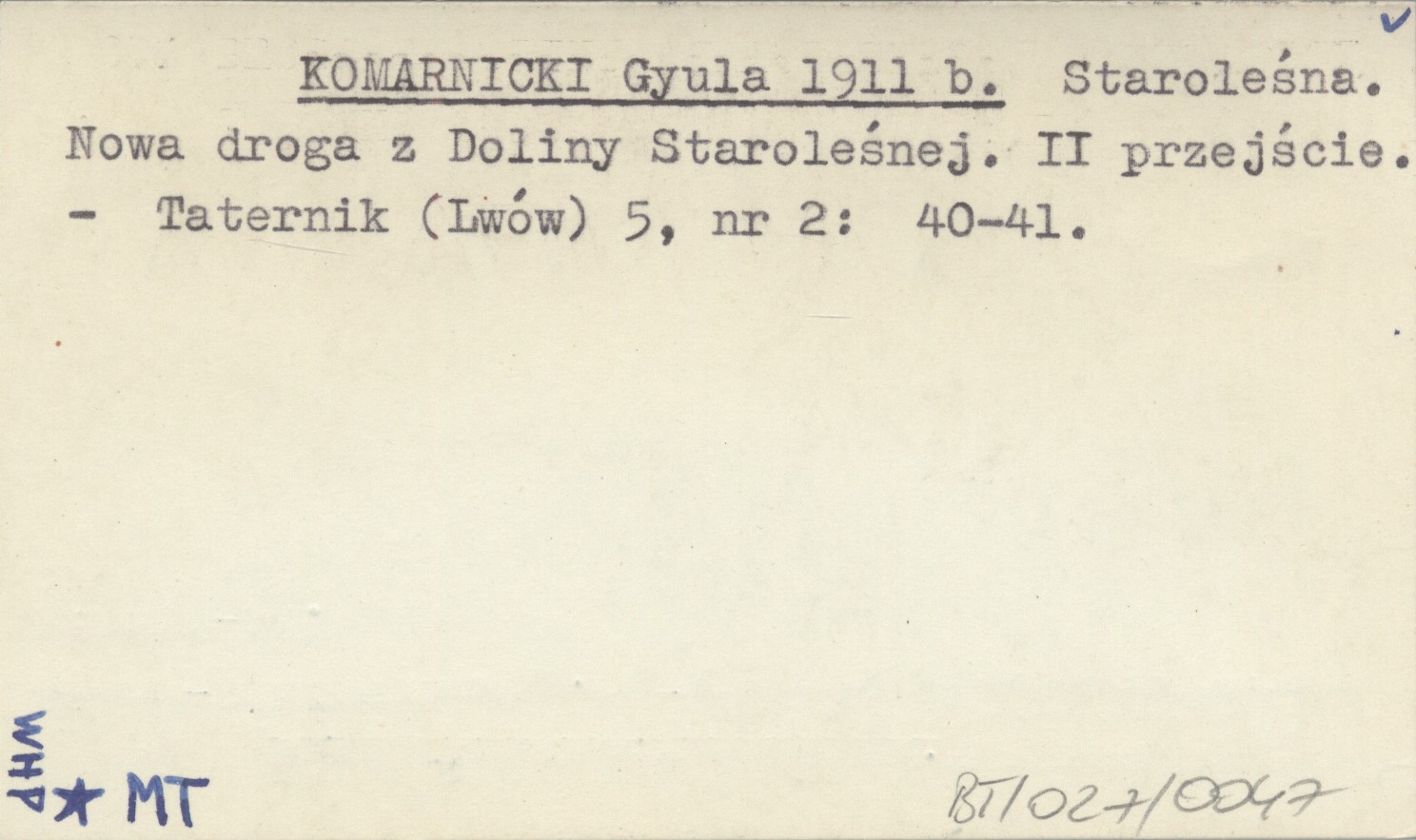 KOMARNICKI Gyula 1911 b Staroleśna. Nowa droga z Doliny Staroleśnej. II przejście.