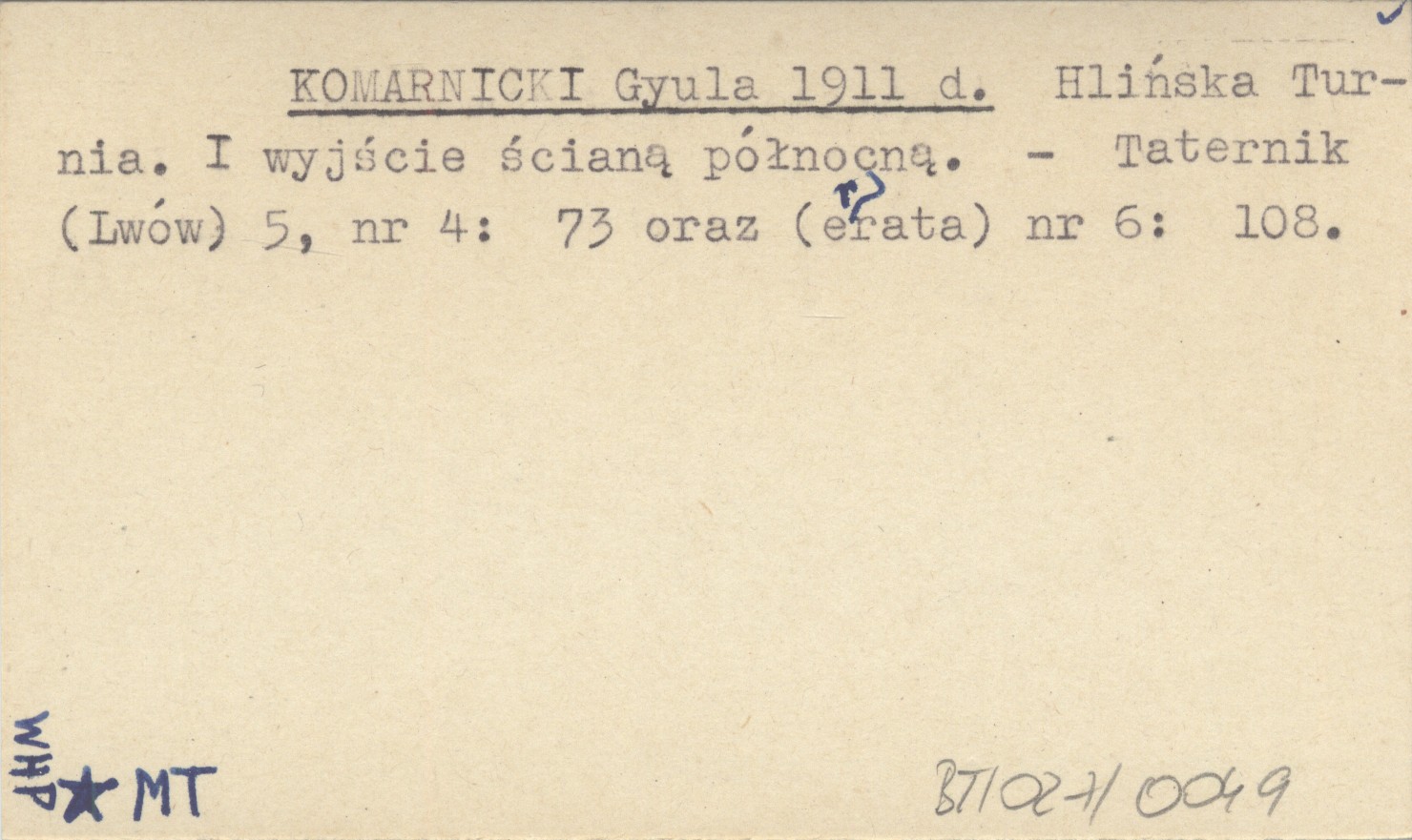 KOMARNICKI Gyula 1911 d Hlińska Turnia. I wyjście ścianą północną.