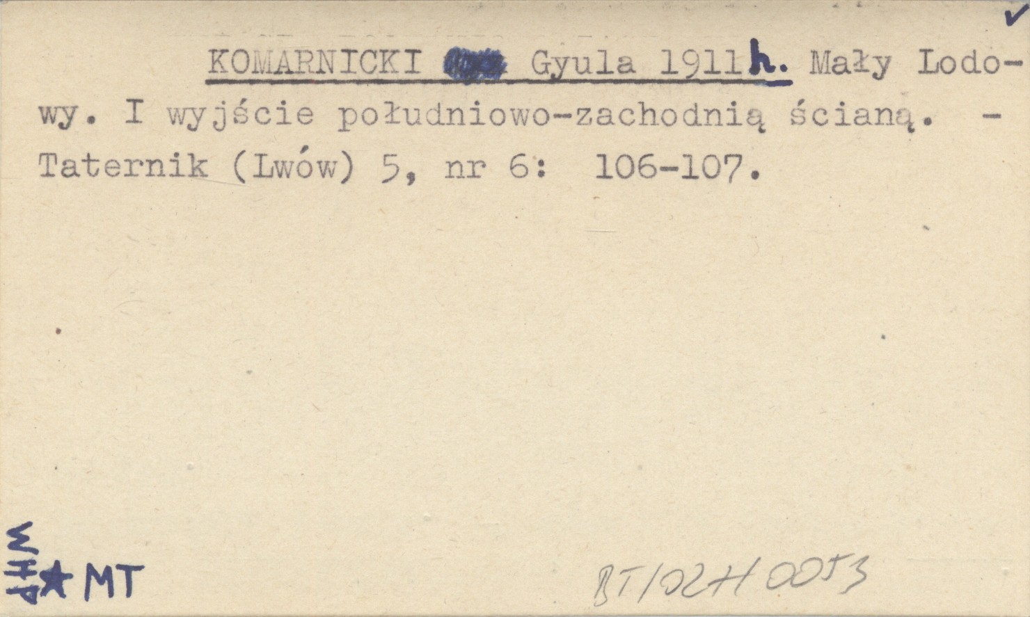 KOMARNICKI Gyula 1911 h Mały Lodowy. I wyjście południowo-zachodnią ścianą.