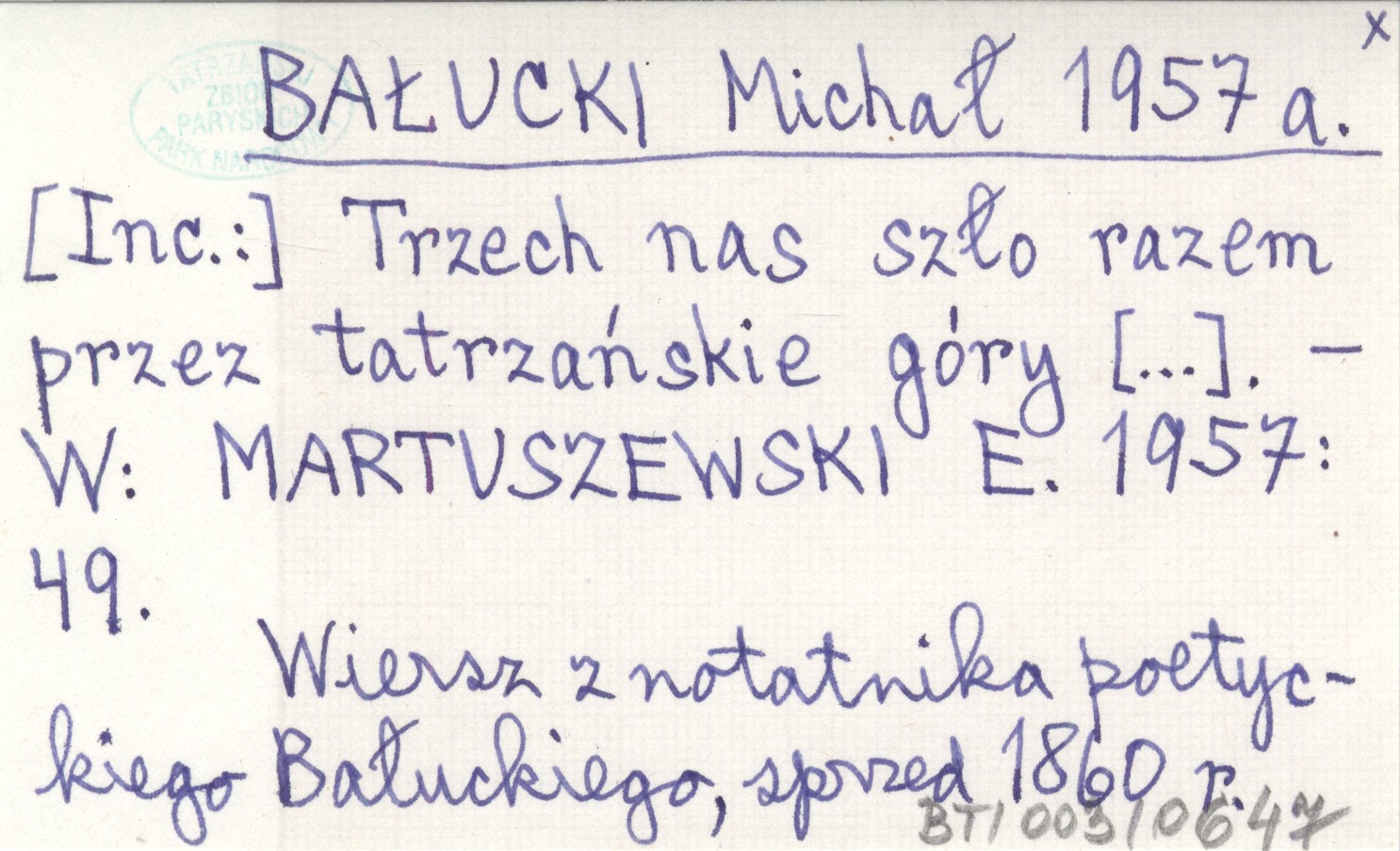 MARTUSZEWSKI E. 1957: 49. , Wiersz z notatnika poetyckiego Bałuckiego, sprzed 1860 r.