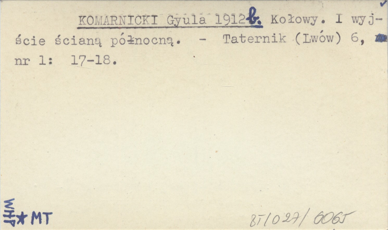 KOMARNICKI Gyula 1912 b Kołowy. I wyjście ścianą północną.