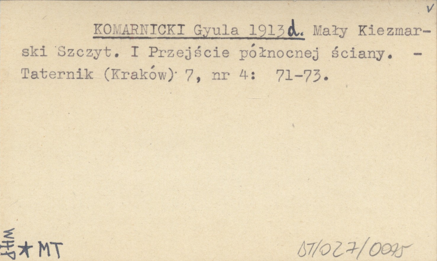 KOMARNICKI Gyula 1913 d Mały Kiezmarski Szczyt. I Przejście północnej ściany.