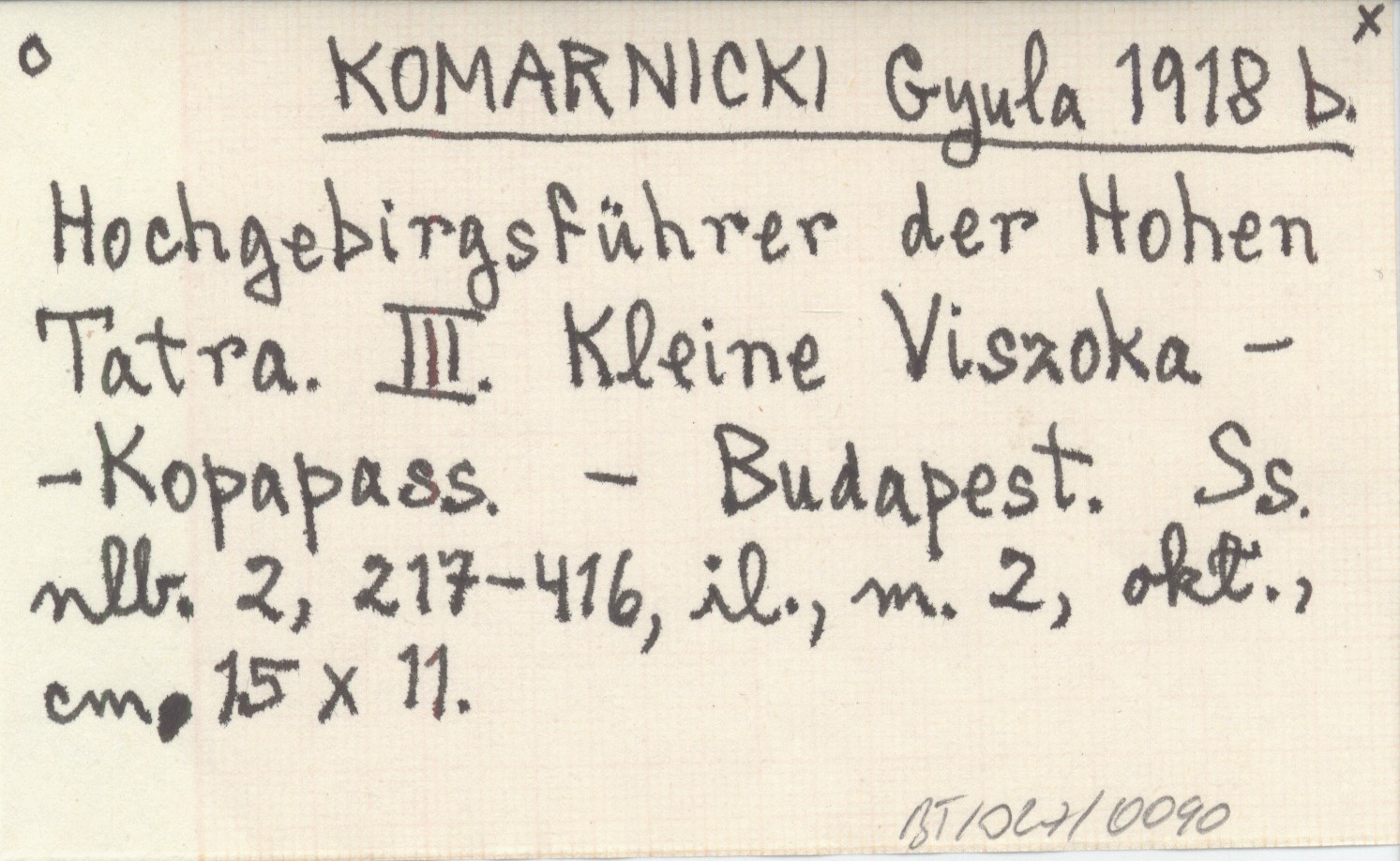 KOMARNICKI Gyula 1918 b Hochgebirgsführer der Hohen Tatra. III. Kleine Viszoka-Kopapass.