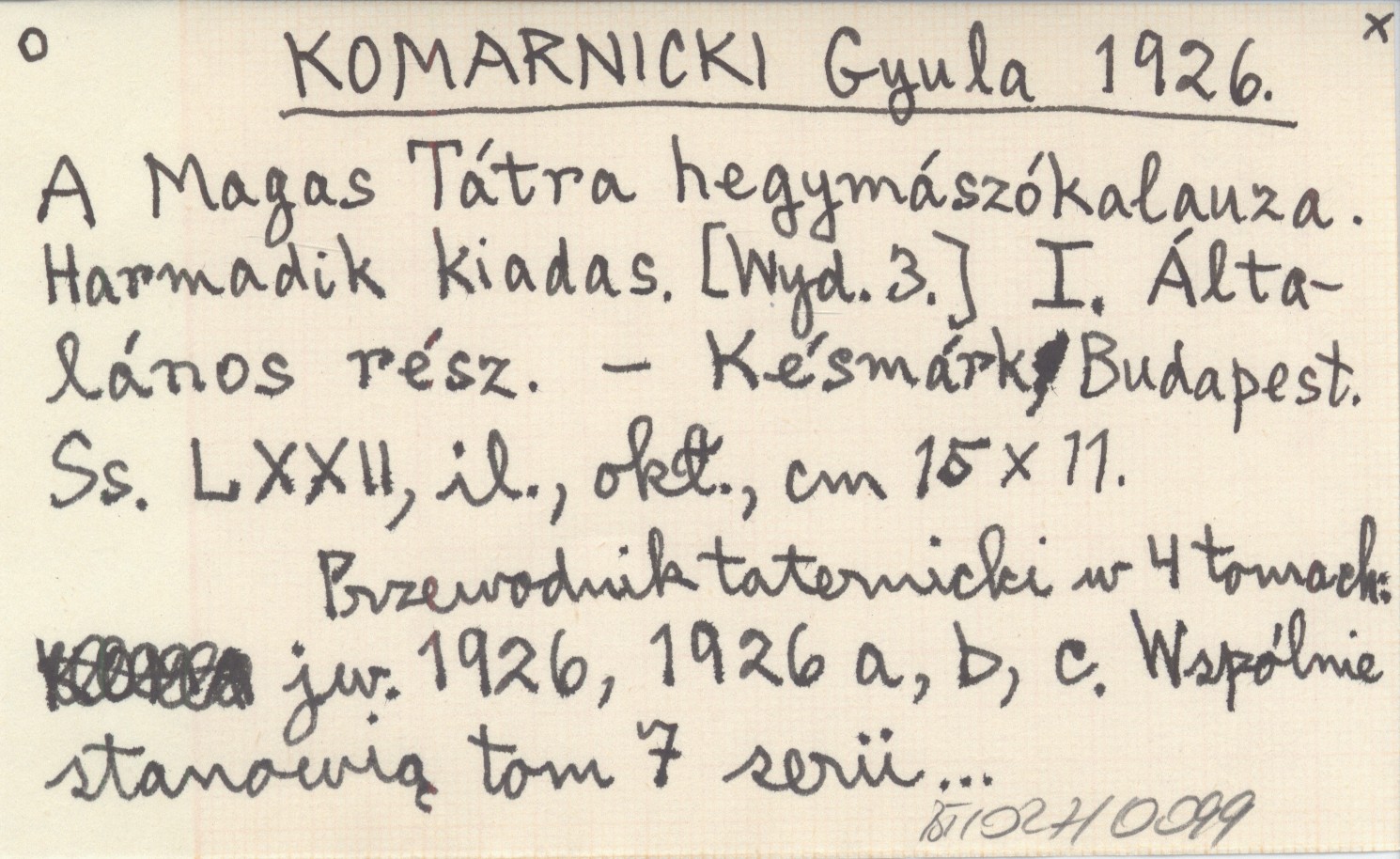 WYD: 3 Késmárk ; Budapest ; , 72 s., il., okł., 15x11 cm. Przewodnik taternicki w 4 tomach: jw. 1926, 1926 a, b, c. Wspólnie stanowią tom 7 serii...