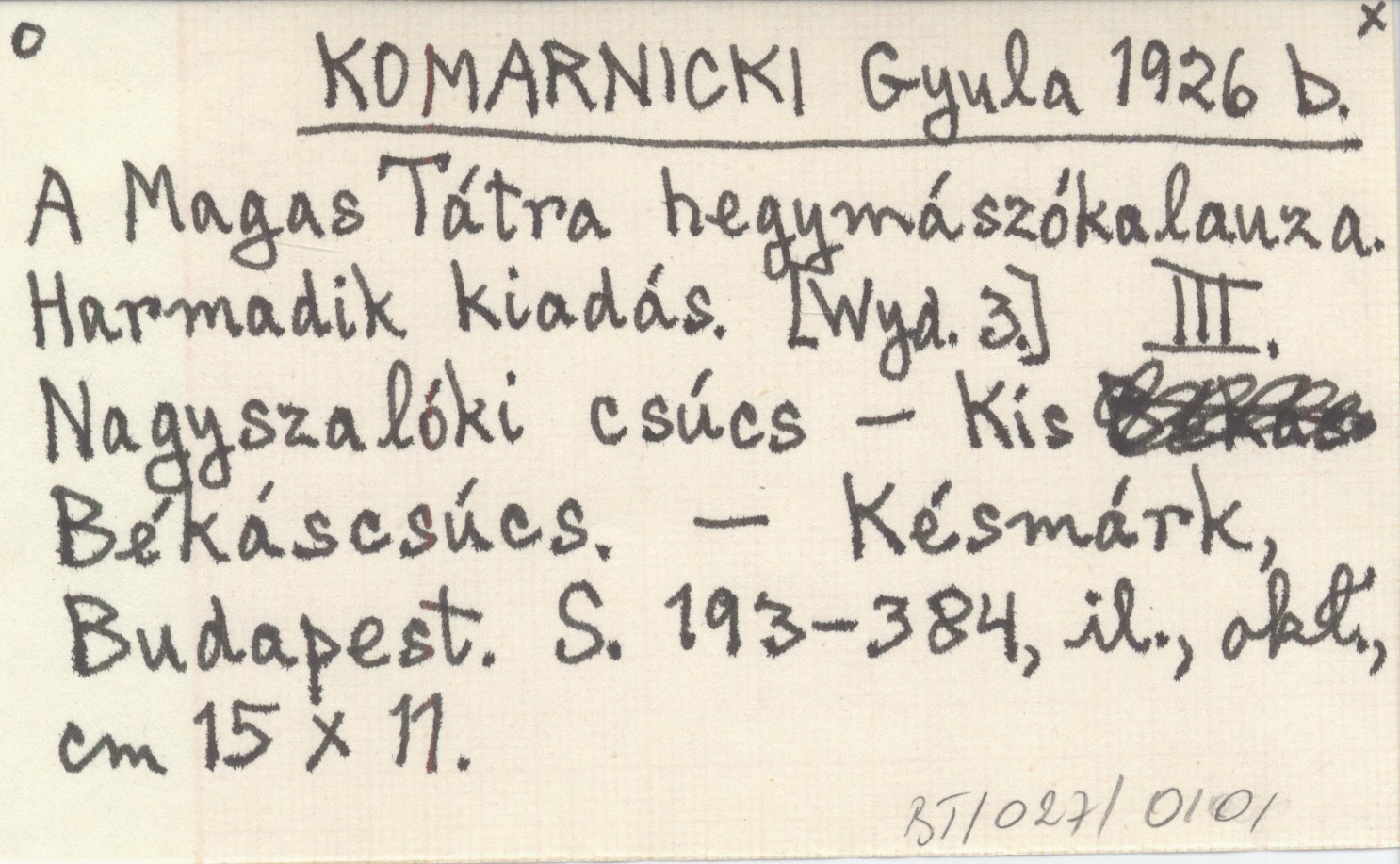 KOMARNICKI Gyula 1926 b A Magas Tátra hegymászókalauza. Harmadik kiadás. III. Nagyszalóki csúcs - Kís Békáscsúcs.