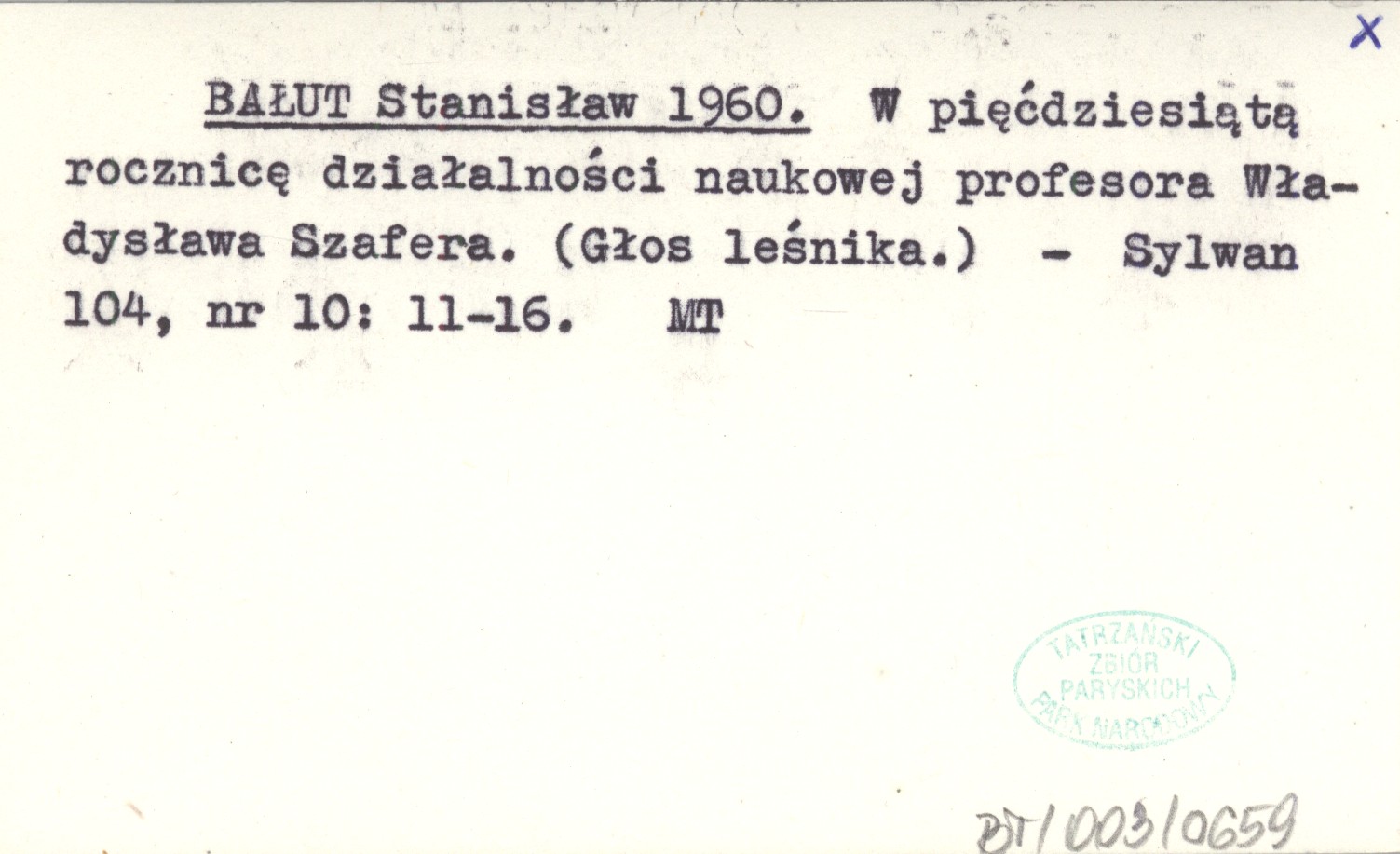 BAŁUT Stanisław 1960 W pięćdziesiątą rocznicę działalności naukowej profesora Władysława Szafera. (Głos Leśnika).