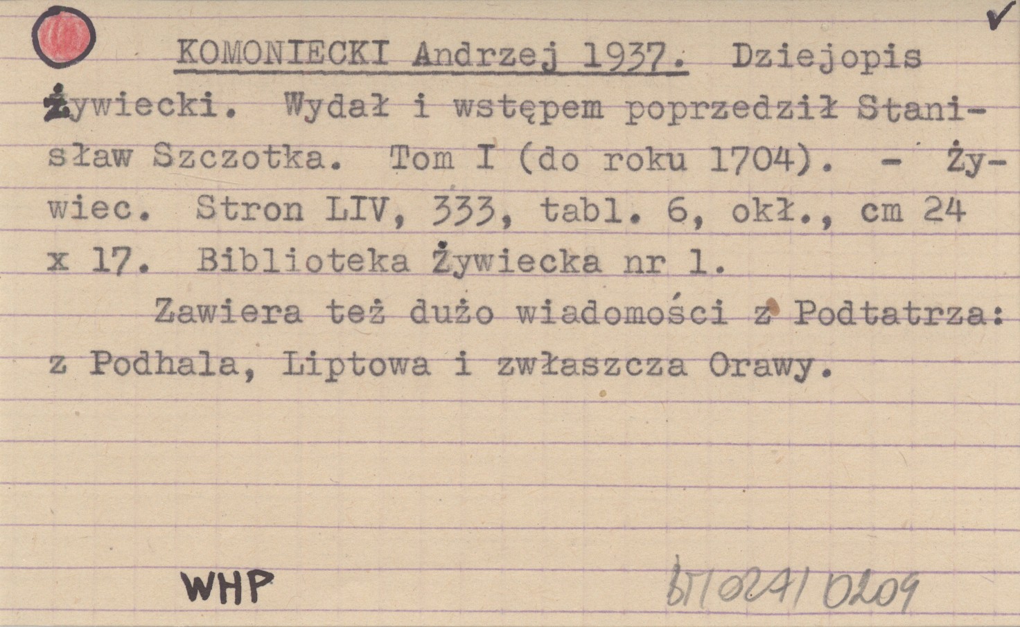 Żywiec , T. 1 (do r. 1704), 54 s., 333, 6 k. tabl., okł., 24x17 cm. Zawiera też dużo wiadomości z Podtatrza: z Podhala, Liptowa i zwłaszcza Orawy. Biblioteka Żywiecka nr 1.
