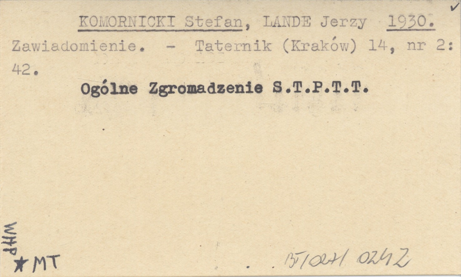 KOMORNICKI Stefan LANDE, Jerzy. ; 1930 Zawiadomienie.