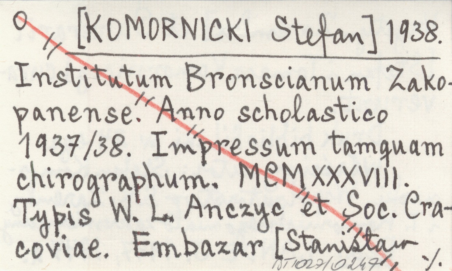 [KOMORNICKI Stefan] 1938 Institutum Bronscianum Zakopanense. Anno scholastico 1937/38. Impressum tamguam chirographum. MCMXXXVIII. Typis W. L. Anczyc et Soc. Cracoviae. Embazar [Stanisław Krystyn Zaremba] et Camerarii [Stefan i Tomasz Komorniccy] curaverunt.
