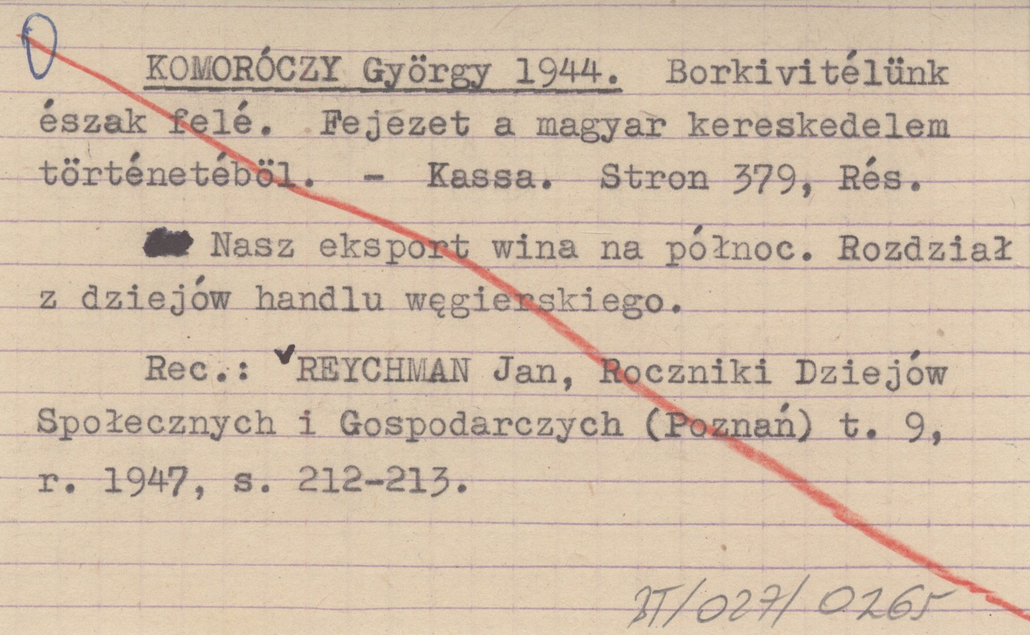 Kassa , 379 s., Rés. Nasz eksport wina na północ. Rozdział z dziejów handlu węgierskiego. REC: REYCHMAN Jan, Roczniki Dziejów Społecznych i Gospodarczych (Poznań) t. 9, r. 1947: 212-213