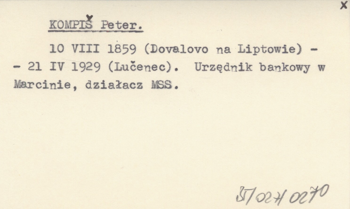 10 VIII 1859 (Dovalovo na Liptowie) - 21 IV 1929 (Lučenec). Urzędnik bankowy w Marcinie, działacz MSS.