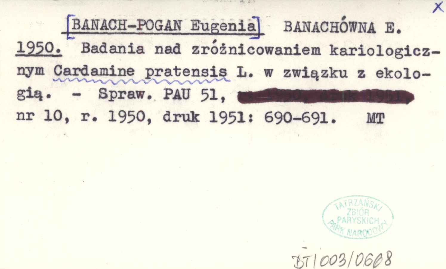 BANACHÓWNA E. [BANACH-POGAN Eugenia] 1950 Badania nad zróżnicowaniem kariologicznym Cardamine pratensis L. w związku z ekologią.