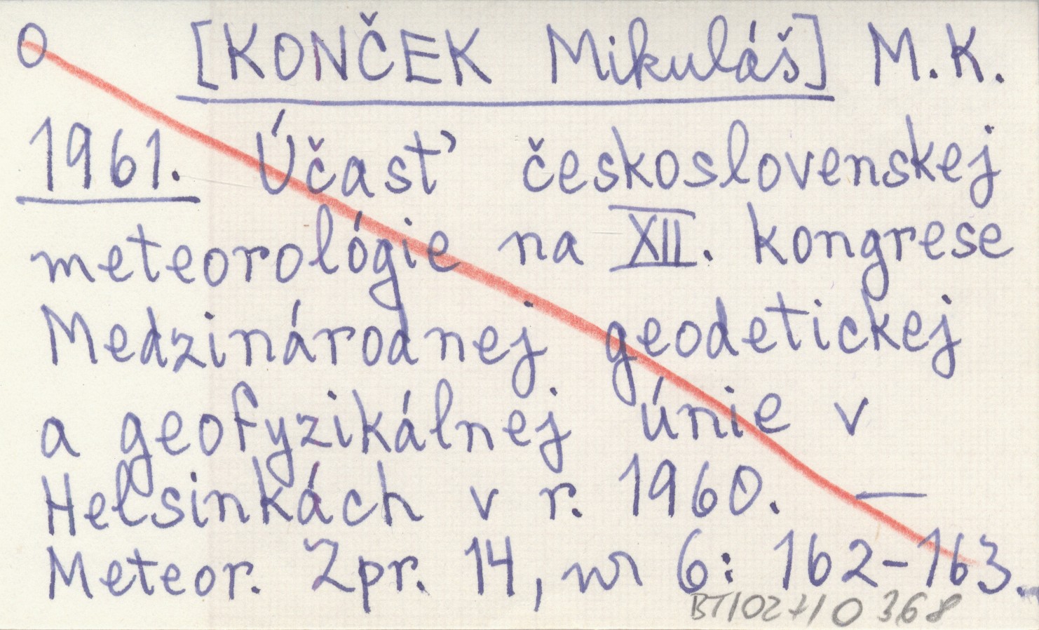 M.K. [KONČEK Mikuláą] 1961 Účas» československej meteorológie na XII. kongrese Medzinárodnej geodetickej a geofyzikálnej únie v Helsinkách v r. 1960.