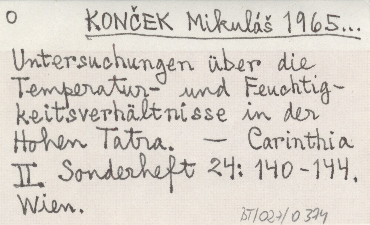 KONČEK Mikuláš 1965... Untersuchungen über die Temperatur- und Feuchtigkeitsverhältnisse in der Hohen Tatra.