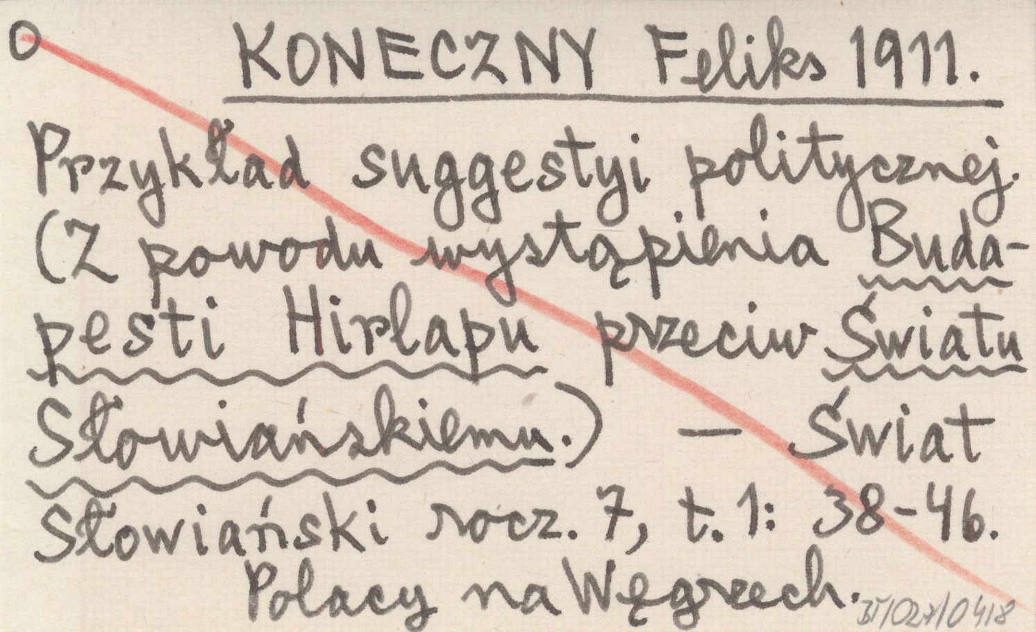 KONECZNY Feliks 1911 Przykład suggestyi politycznej. (Z powodu wystąpienia Budapesti Hirlapu przeciw Światu Słowiańskiemu.).