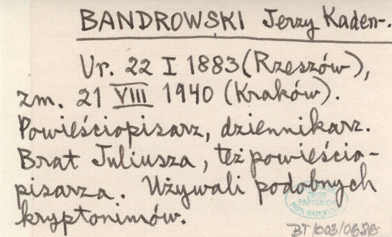 Ur. 22 I 1883 (Rzeszów), zm. 21 VIII 1940 (Kraków). Powieściopisarz, dziennikarz. Brat Juliusza, też powieściopisarza. Używali podobnych kryptonimów.