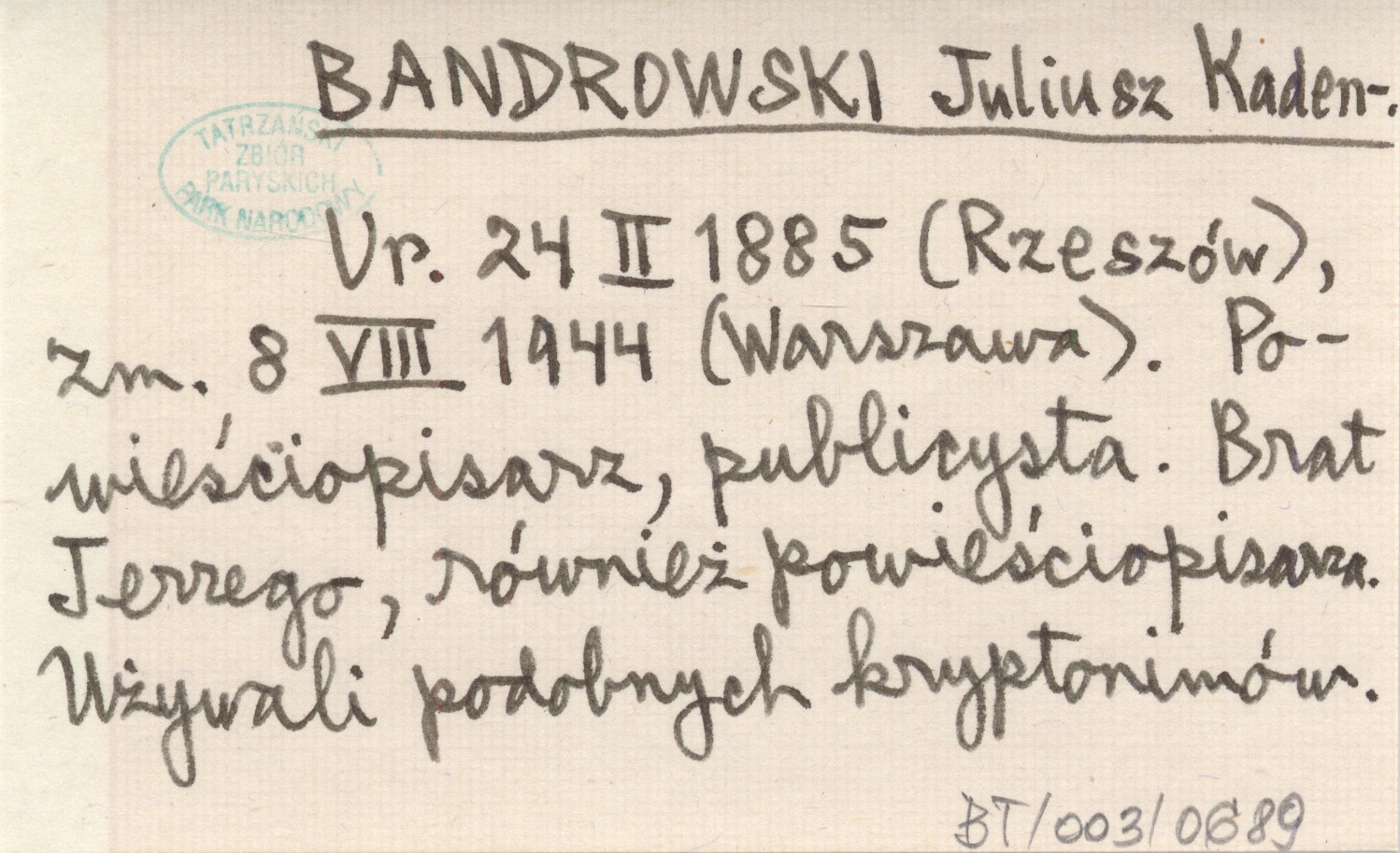 Ur. 24 II 1885 (Rzeszów), zm. 8 VIII 1944 (Warszawa). Powieściopisarz, publicyta. Brat Jerzego, również powieściopisarza. Używali podobnych kryptonimów.