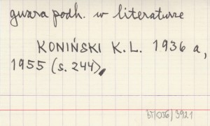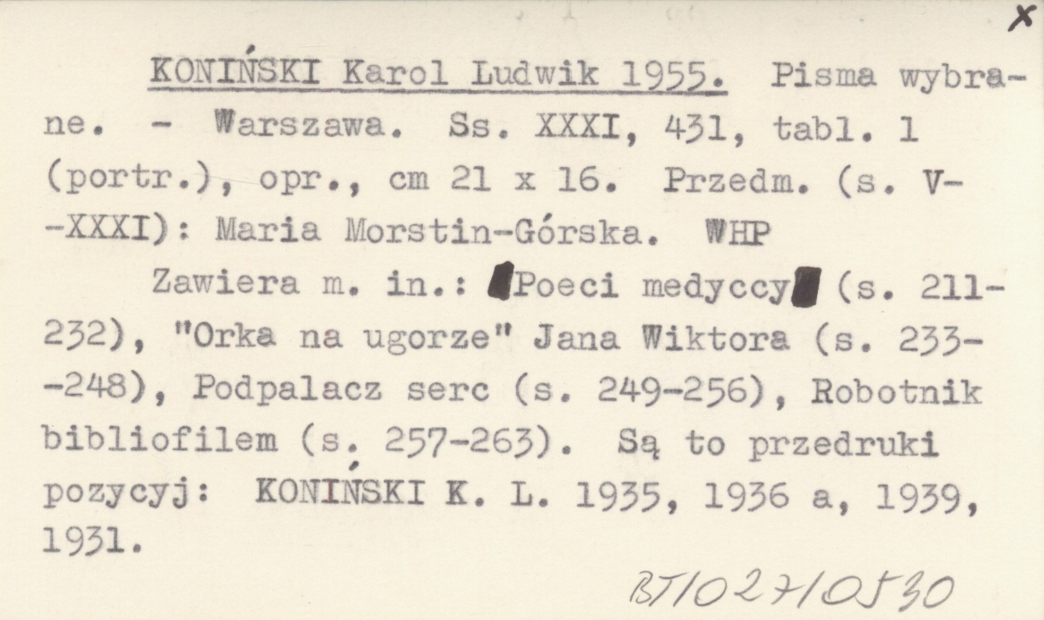 Warszawa , 31 s., 431, 1 k. tabl. (portr.), opr., 21x16 cm. Przedm. (s. 5-31): Maria Morstin-Górska. Zawiera m.in.: Poeci medyccy (s. 211-232), "Orka na ugorze" Jana Wiktora (s. 233-248), Podpalacz serc (s. 249-256), Robotnik bibliofilem (s. 257-263). Są to przedruki pozycyj: KONIŃSKI K. L. 1935, 1936 a, 1939, 1931.