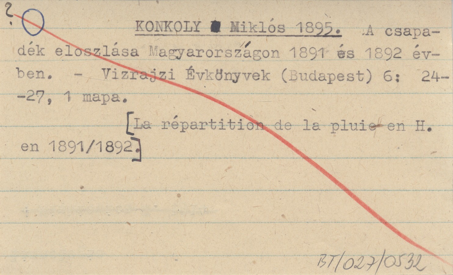KONKOLY Niklós 1895 A csapadék eloszlása Magyarországon 1891 és 1892 évben.