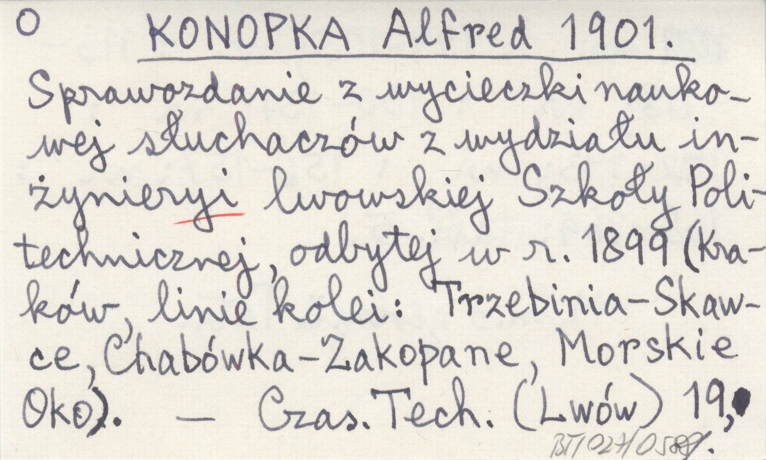 KONOPKA Alfred 1901 Sprawozdanie z wycieczki naukowej słuchaczów z wydziału inżynieryi lwowskiej Szkoły Politechnicznej, odbytej w r. 1899 (Kraków, linie kolei: Trzebinia-Skawce, Chabówka-Zakopane, Morskie Oko).