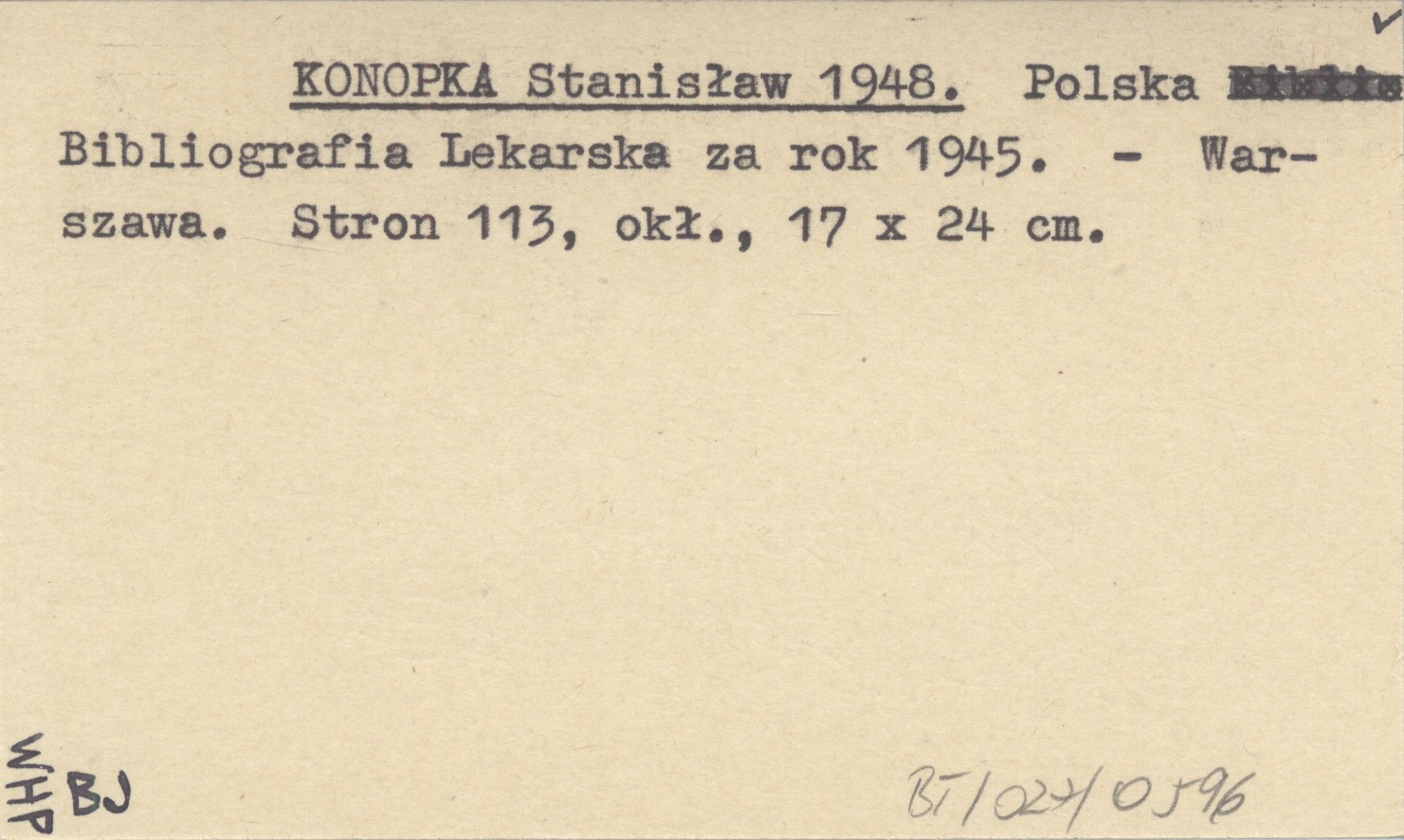 KONOPKA Stanisław 1948 Polska Bibliografia Lekarska za rok 1945.