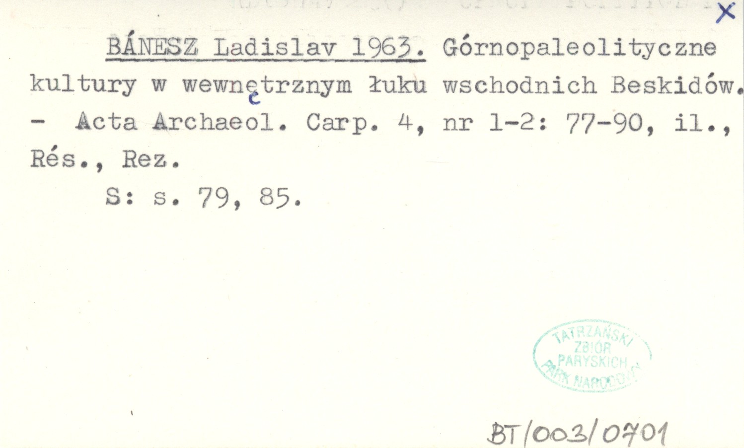BÁNESZ Ladislav 1963 Górnopaleolityczne kultury w wewnętrznym łuku wschodnich Beskidów.