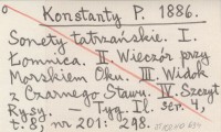 Konstanty P. 1886 Sonety tatrzańskie. I. Łomnica. II. Wieczór przy Morskiem Oku. III. Widok z Czarnego Stawu. IV. Szczyt Rysy.