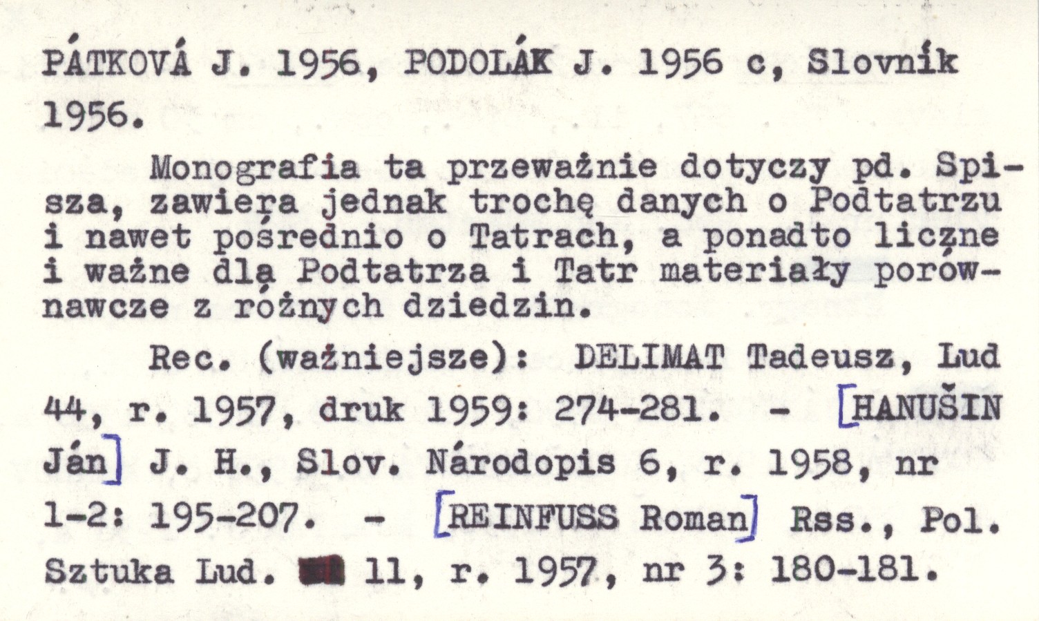Bratislava (Práce Národopisného ústavu Slovenskej akadémie vied, nr 1) , 667 s., il., opr., obw., 20x22 cm. Etnogr. monografia wsi Żakarowce na pd. Spiszu. Zawiera prace: BURLASOVÁ S. 1956, ČAJÁNKOVÁ E. 1956, FILOVÁ B. 1956, 1956 a, KOSOVÁ M. 1956, KOVAČEVIČOVÁ S. 1956 c, MARKOV J. 1956 b, MARKUŠ M. 1956, MJARTAN J. 1956 a, PÁTKOVÁ J. 1956, PODOLÁK J. 1956 c, Slovník 1956. Monografia ta przeważnie dotyczy pd. Spisza, zawiera jednak trochę danych o Podtatrzu i nawet pośrednio o Tatrach, a ponadto liczne i ważne dla Podtatrza i Tatr materiały porównawcze z różnych dziedzin. (ważniejsze): DELIMAT Tadeusz, Lud 44, r. 1957, druk 1959: 274-281.- [HANUŠIN Ján] J. H., Slov. Národopis 6, r. 1958, nr 1-2: 195-207.- [REINFUSS Roman] Rss., Pol. Sztuka Lud. 11, r. 1957, nr 3: 180-181.