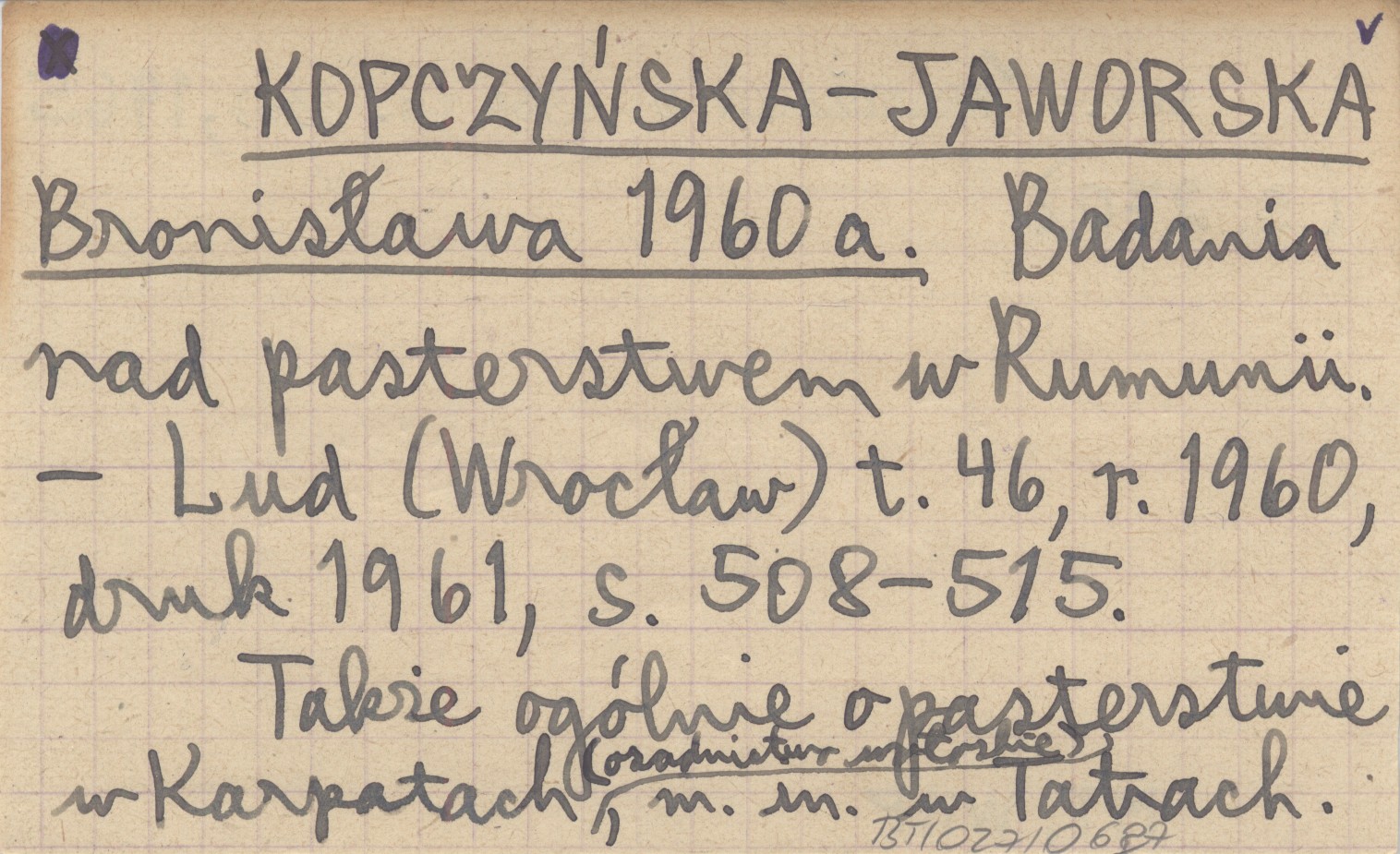Lud (Wrocław) , R. 1960, druk 1961, t. 46: 508-515. Także ogólnie o pasterstwie w Karpatach (osadnictwo ...), m.in. w Tatrach. REC: KRANDŽALOV D. 1964 (s. 336), 1965 (s. 270)