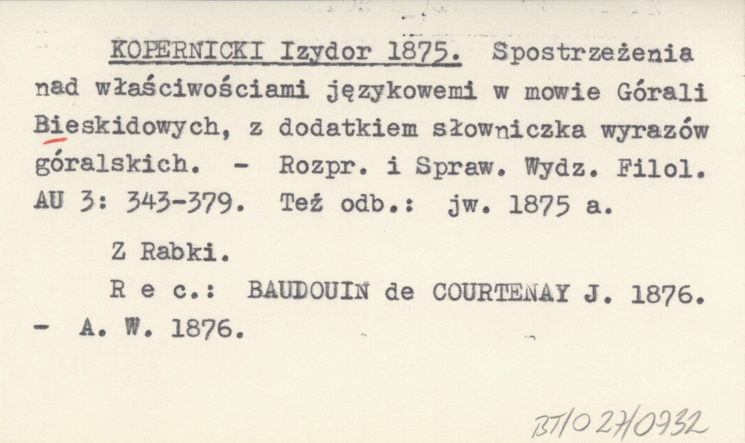 Rozprawy i Sprawozdania Wydziału Filologicznego Akademii Umiejętności, 3: 343-379. Z Rabki. Też odb.: jw. 1875 a REC: BAUDOUIN de COURTENAY J. 1876 ; A. W. 1876 ;