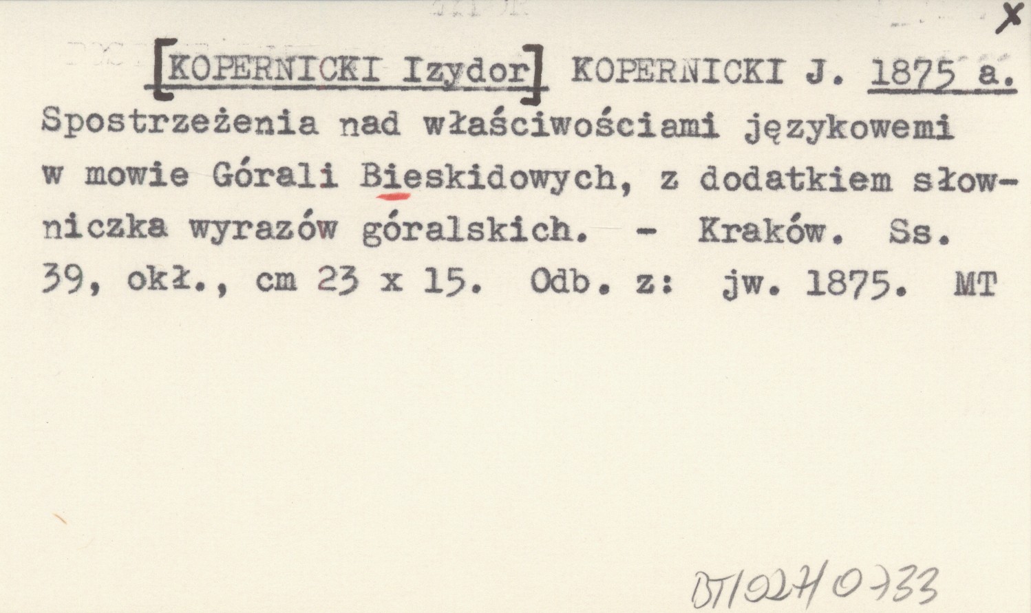 [KOPERNICKI Izydor] KOPERNICKI, J. ; 1875 a Spostrzeżenia nad właściwościami językowemi w mowie Górali Bieskidowych, a dodatkiem słowniczka wyrazów góralskich.