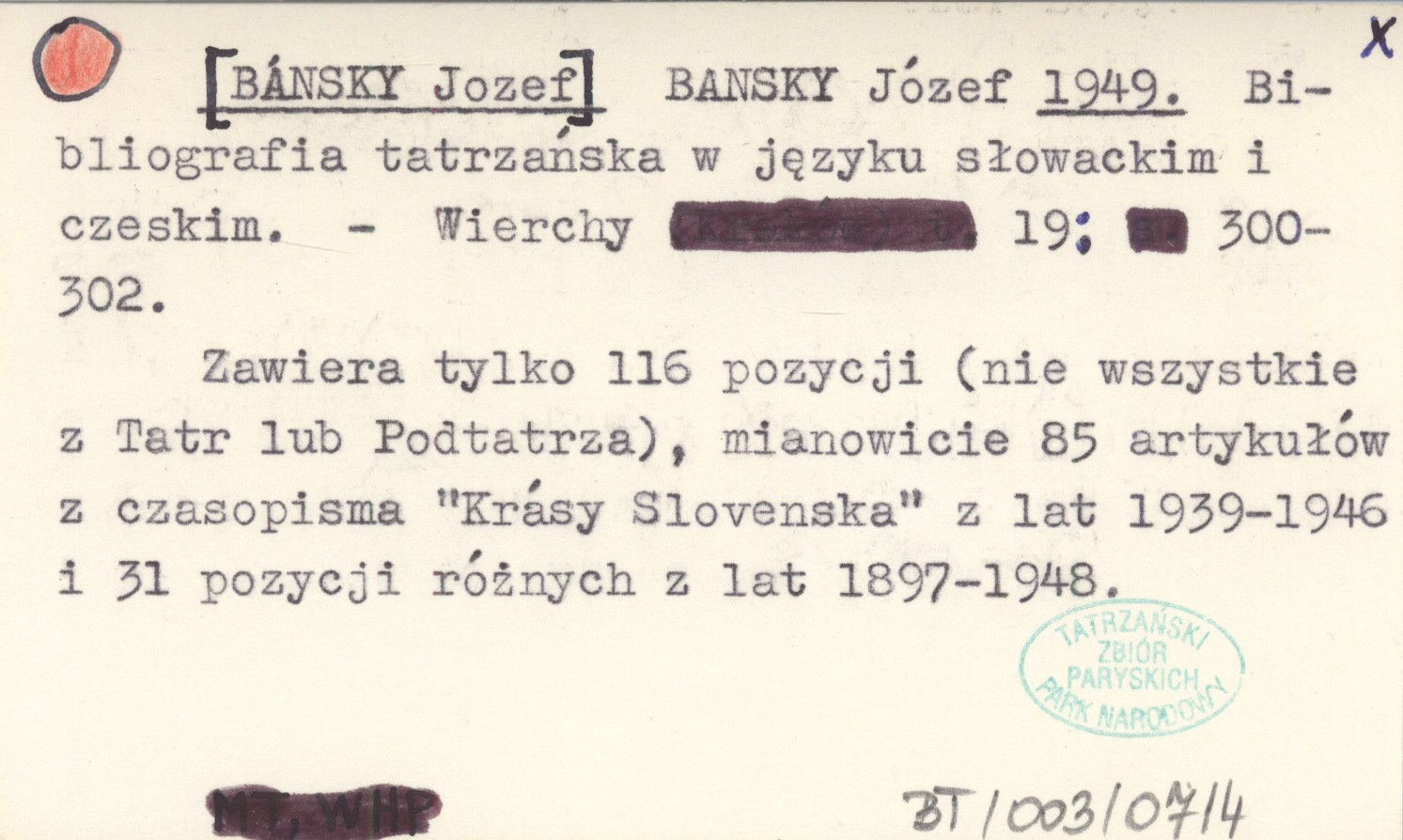 BANSKY Józef [BÁNSKY Jozef] 1949 Bibliografia tatrzańska w języku słowackim i czeskim.