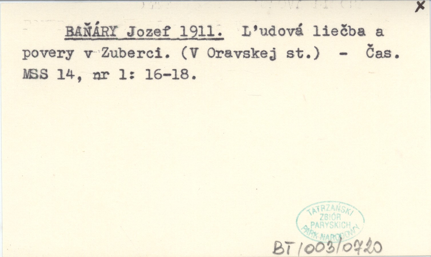 BAŇÁRY Jozef 1911 Ľudová liečba a povery v Zuberci. (V Oravskej st.).