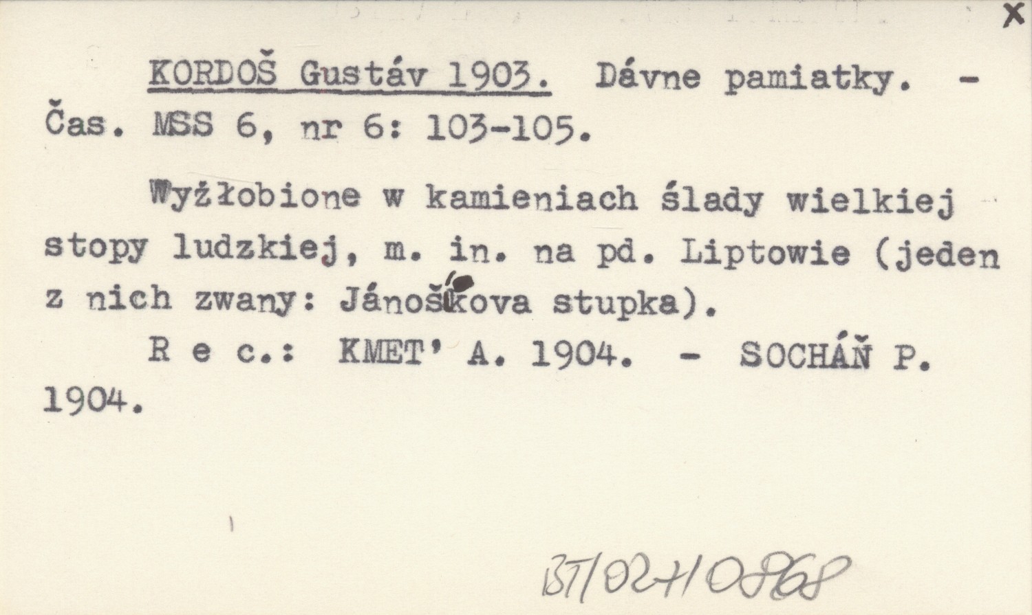 Čas. MSS, 6, nr 6: 103-105. Wyżłobione w kamieniach ślady wielkiej stopy ludzkiej, m.in. na pd. Liptowie (jeden z nich zwany: Jánošíkova stupka). REC: KMEŤ A. 1904 ; SOCHÁŇ P. 1904 ;