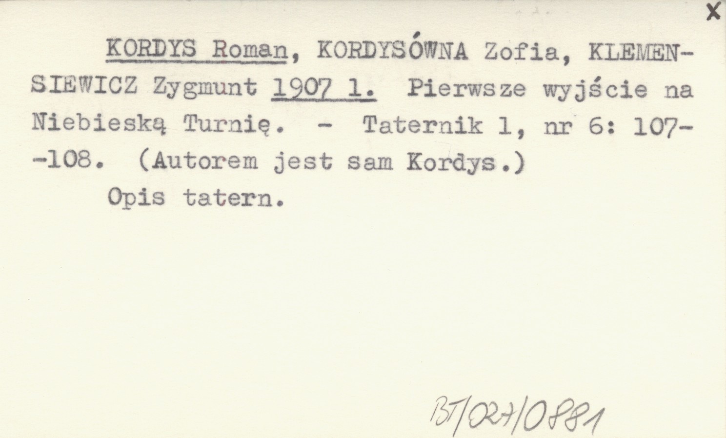 KORDYS Roman KORDYSÓWNA, Zofia. ; KLEMENSIEWICZ, Zygmunt. ; 1907 l Pierwsze wyjście na Niebieską Turnię.