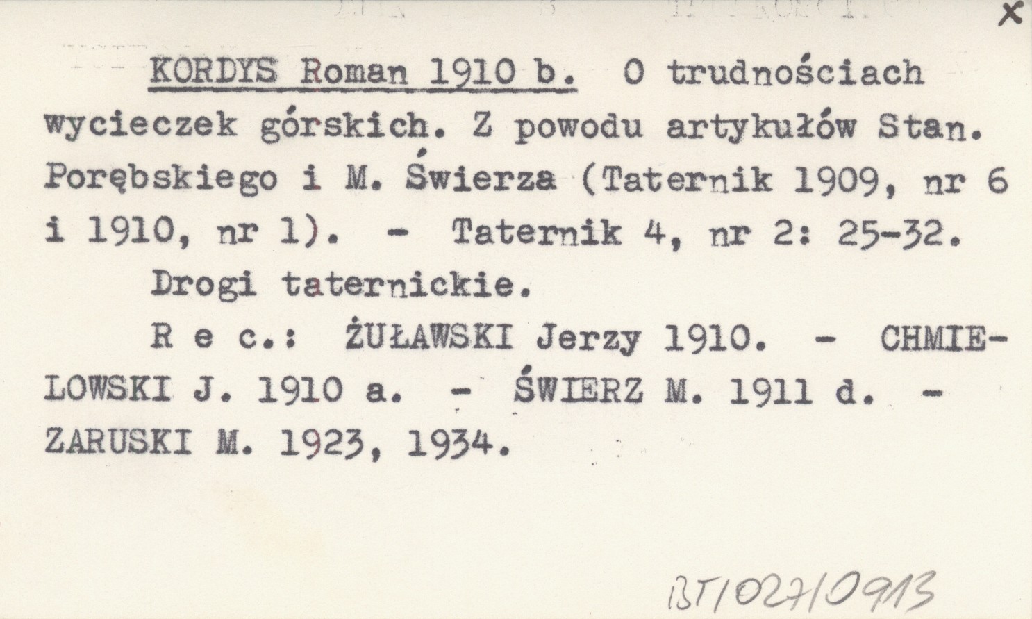 KORDYS Roman 1910 b O trudnościach wycieczek górskich. Z powodu artykułów Stan. Porębskiego i M. Świerza (Taternik 1909, nr 6 i 1910, nr 1).