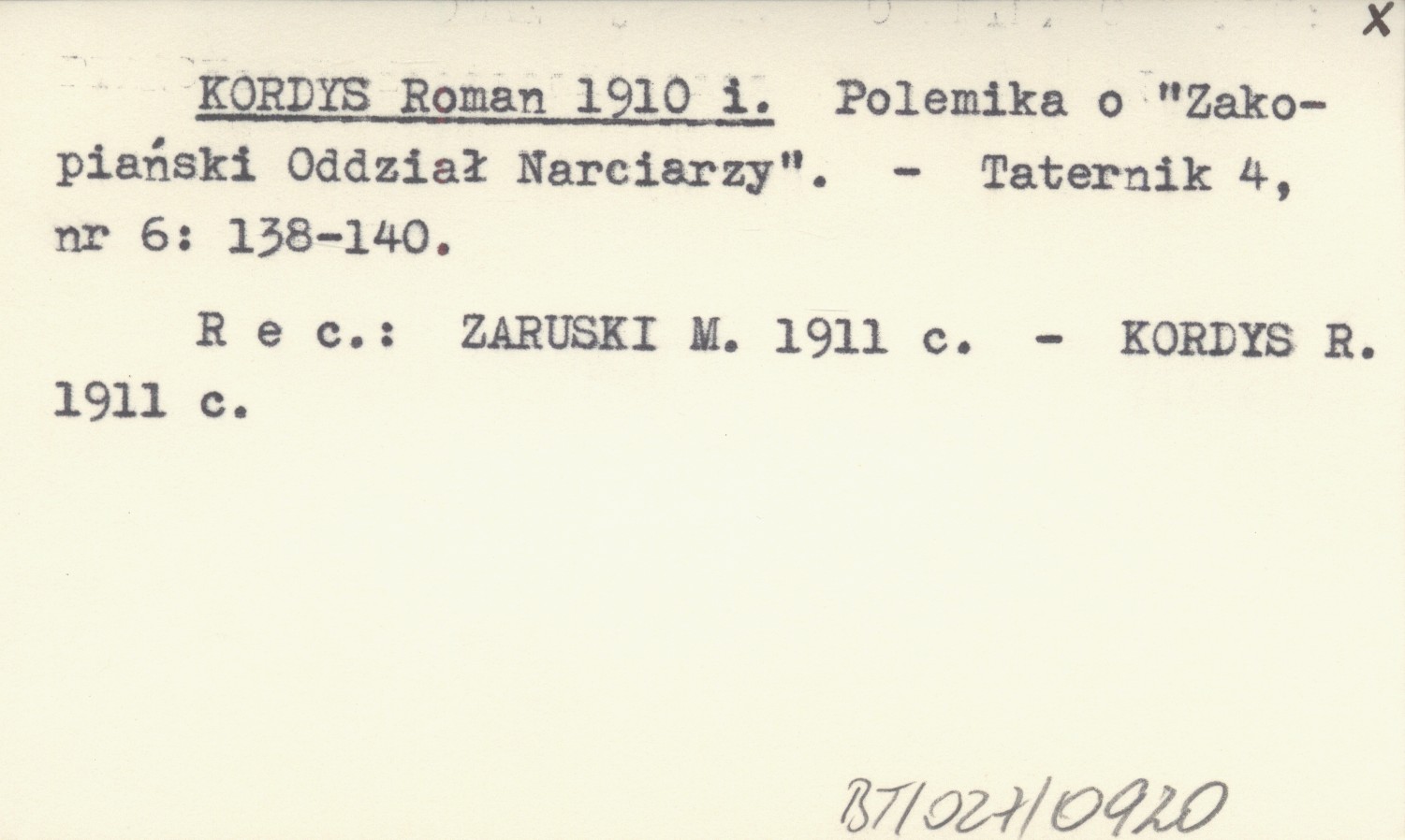 Taternik, 4, nr 6: 138-140. REC: ZARUSKI M. 1911 c ; KORDYS R. 1911 c ;