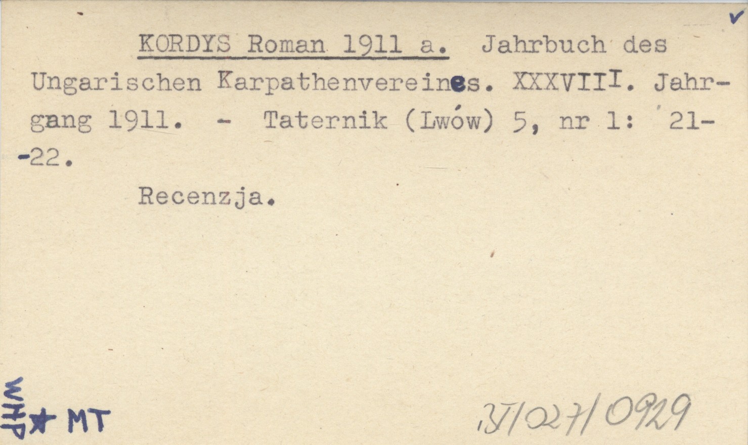 KORDYS Roman 1911 a Jahrbuch des Ungarischen Karpathenvereines. XXXVIII. Jahrgang 1911.