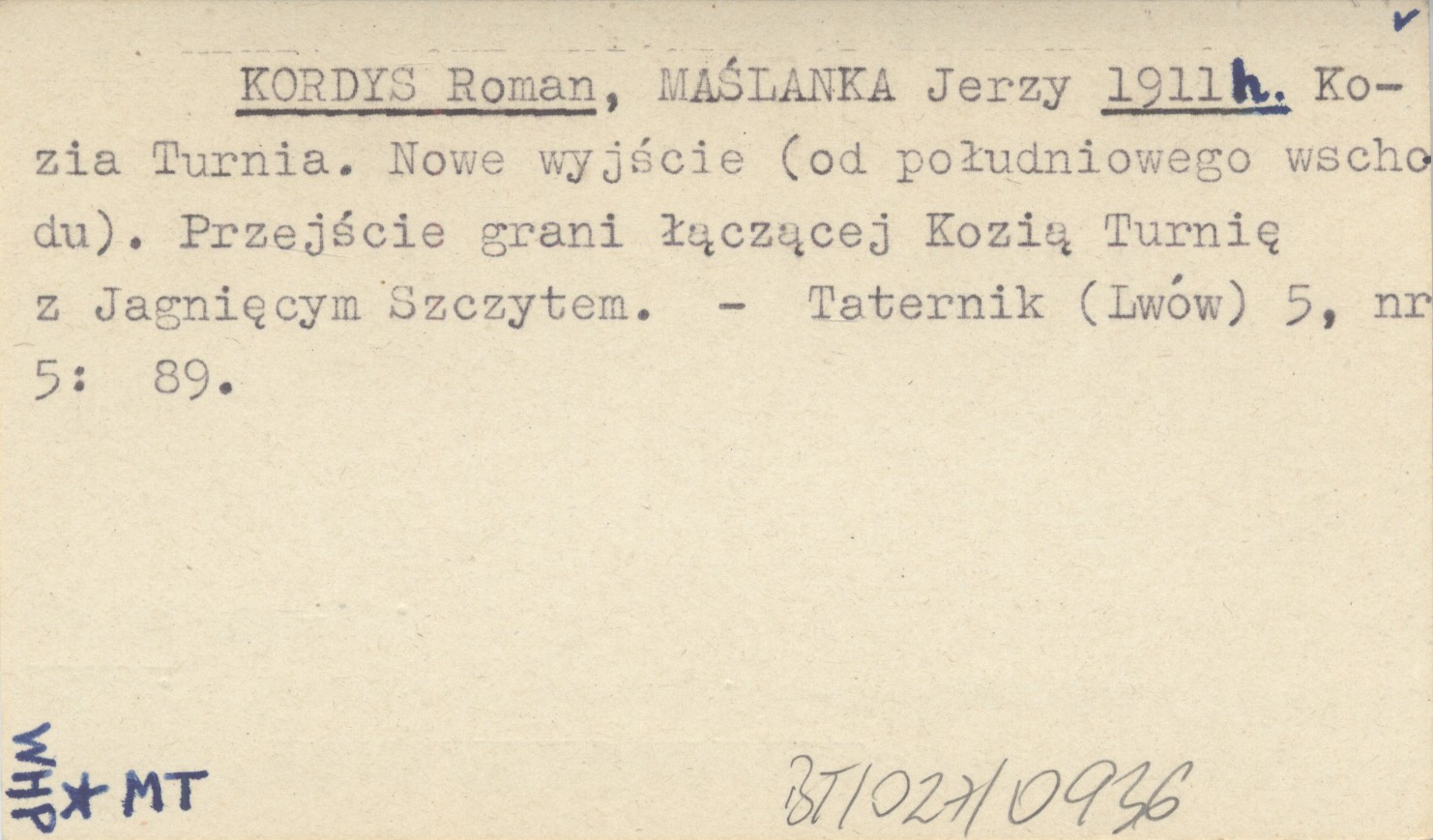 KORDYS Roman MAŚLANKA, Jerzy. ; 1911 h Kozia Turnia. Nowe wyjście (od południowego wschodu). Przejście grani łączącej Kozią Turnię z Jagnięcym Szczytem.