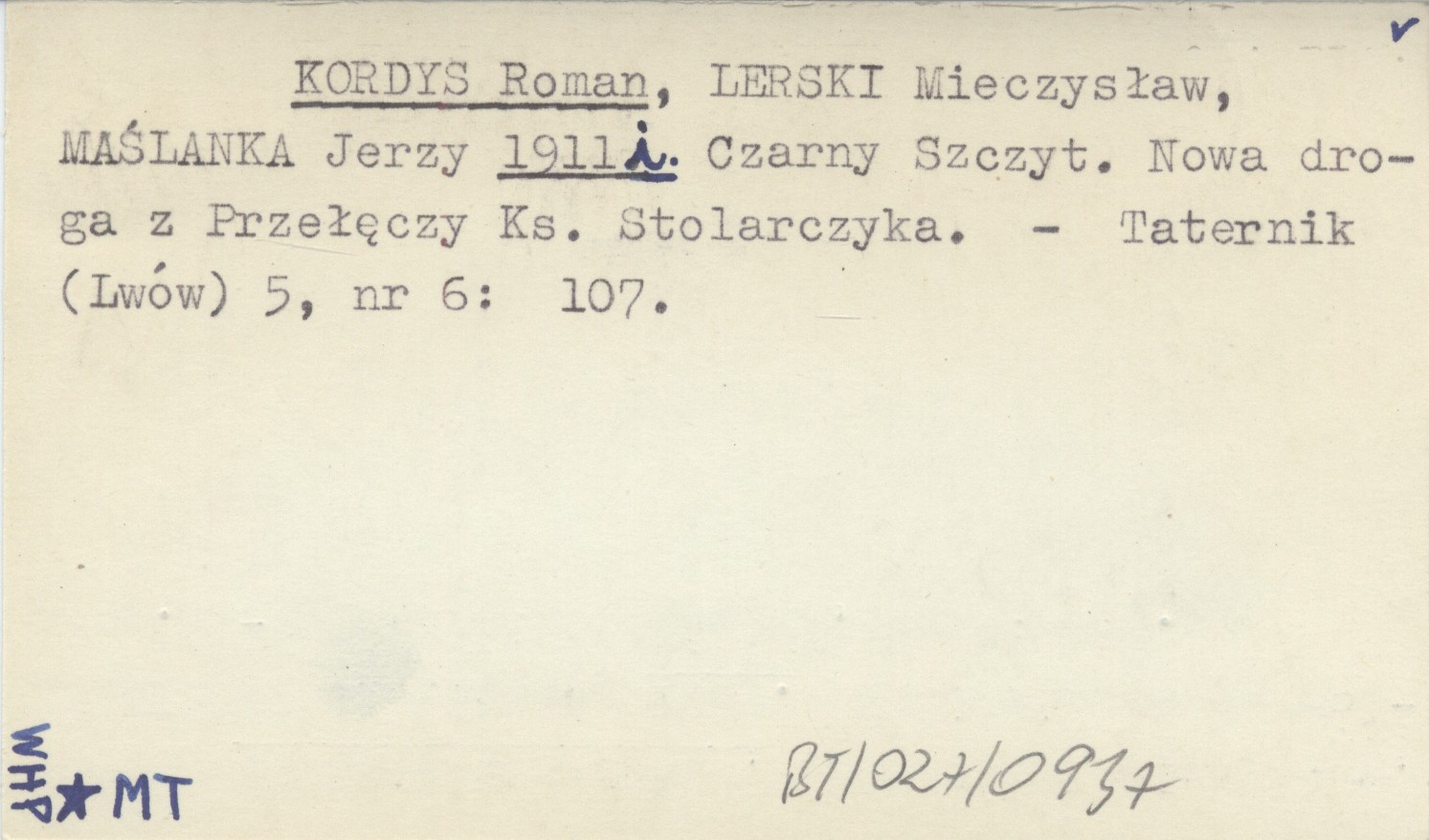 KORDYS Roman LERSKI, Mieczysław. ; MAŚLANKA, Jerzy. ; 1911 i Czarny Szczyt. Nowa droga z Przełęczy Ks. Stolarczyka.