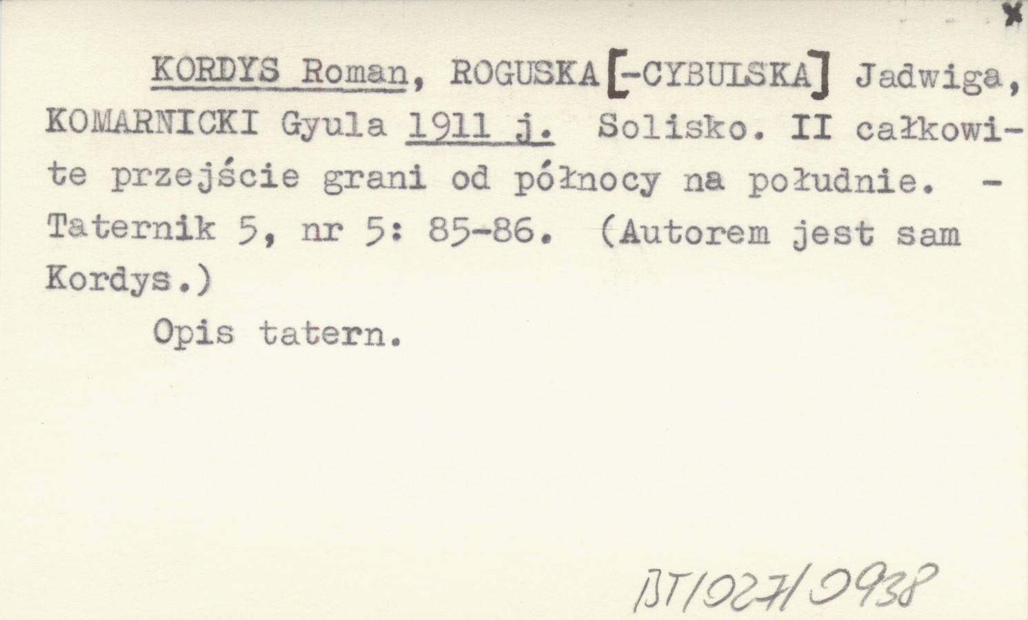 KORDYS Roman ROGUSKA[-CYBULSKA], Jadwiga. ; KOMARNICKI, Gyula. ; 1911 j Solisko. II całkowite przejście grani od północy na południe.