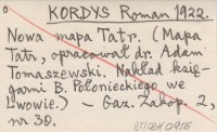 KORDYS Roman 1922 Nowa mapa Tatr. (Mapa Tatr, opracował dr. Adam Tomaszewski. Nakład księgarni B. Połonieckiego we Lwowie.).