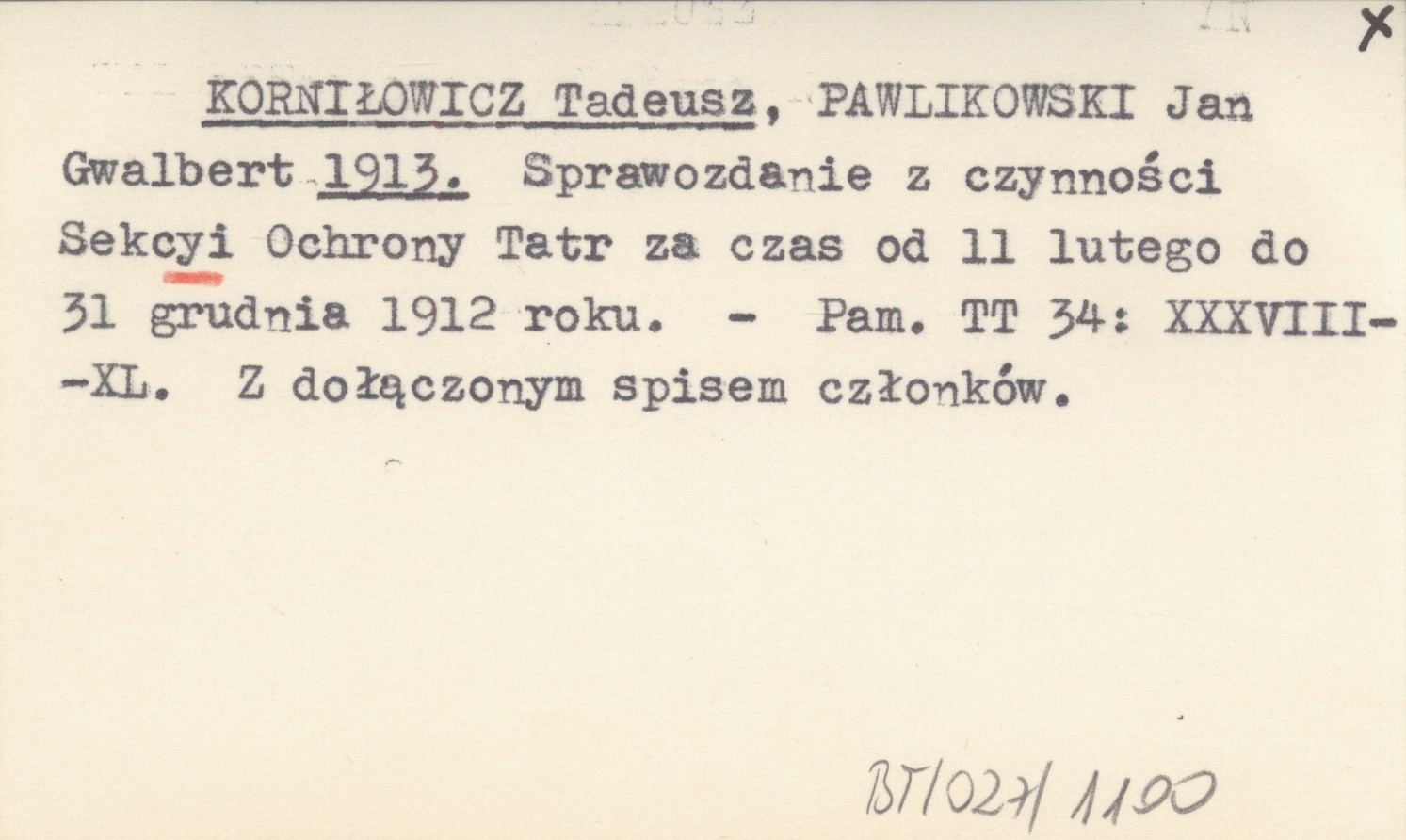 KORNIŁOWICZ Tadeusz PAWLIKOWSKI, Jan Gwalbert. ; 1913 Sprawozdanie z czynności Sekcyi Ochrony Tatr za czas od 11 lutego do 31 grudnia 1912 roku.