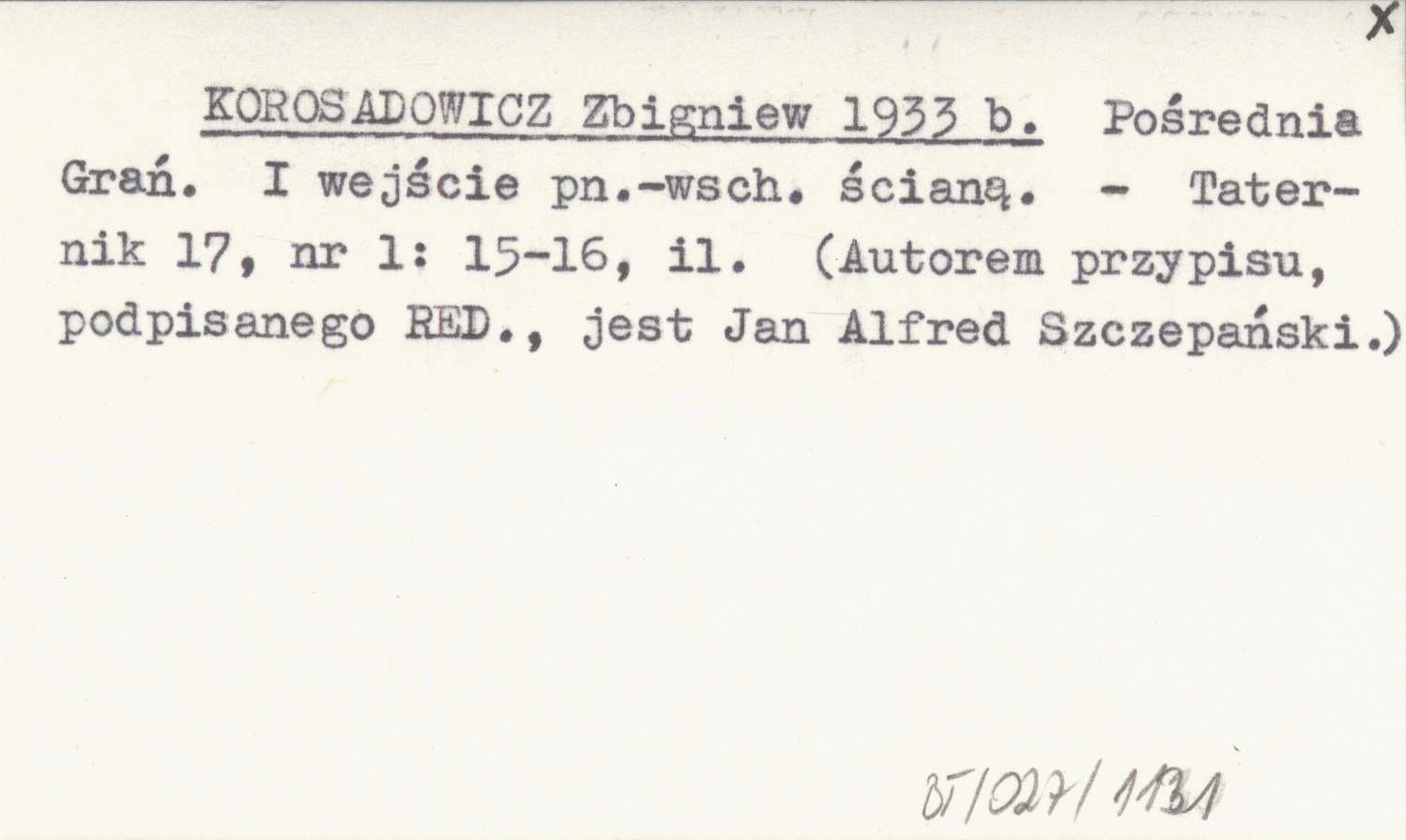 KOROSADOWICZ Zbigniew 1933 b Pośrednia Grań. I wejście pn.-wsch. ścianą.
