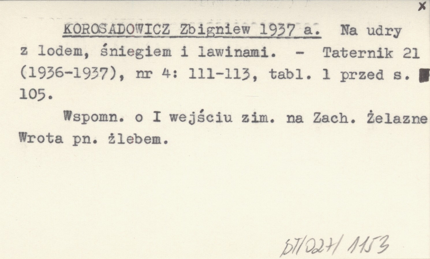 Taternik, 21 (1936-1937), nr 4: 111-113, 1 k. tabl. (przed s. 105). Wspomn. o I wejściu zim. na Zach. Żelazne Wrota pn. żlebem.