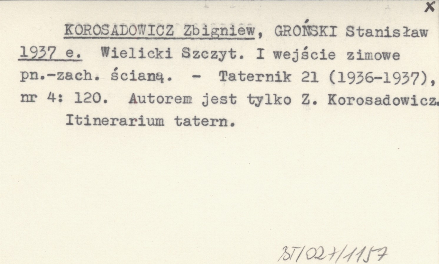 KOROSADOWICZ Zbigniew GROŃSKI, Stanisław. ; 1937 e Wielicki Szczyt. I wejście zimowe pn.-zach. ścianą.