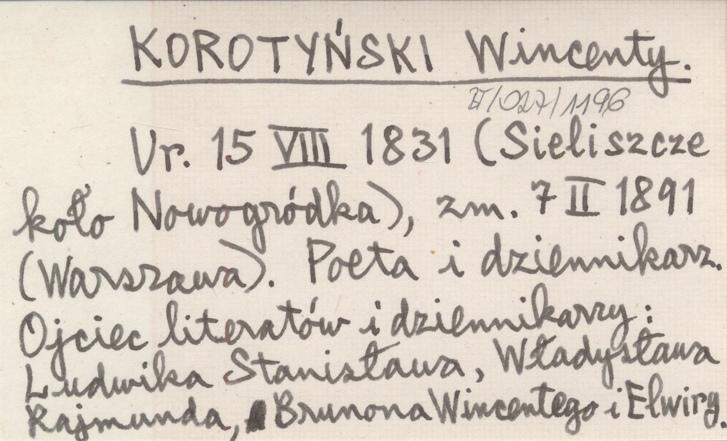 Ur. 15 VIII 1831 (Sieliszcze koło Nowogródka), zm. 7 II 1891 (Warszawa). Poeta i dziennikarz. Ojciec literatów i dziennikarzy: Ludwika Stanisława, Władysława Rajmunda, Brunona Wincentego i Elwiry.