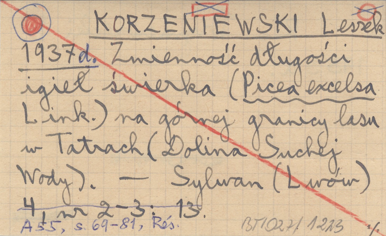 KORZENIEWSKI Leszek 1937 d Zmienność długości igieł świerka (Picea excelsa Link.) na górnej granicy lasu w Tatrach (Dolina Suchej Wody).
