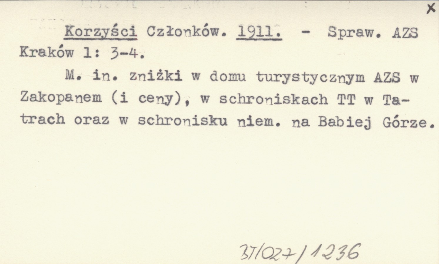 Sprawozdania AZS (Kraków) , 1: 3-4. M.in. zniżki w domu turystycznym AZS w Zakopanem (i ceny), w schroniskach TT w Tatrach oraz w schronisku niem. na Babiej Górze.